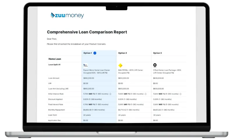 * Discounted rate available for owner occupied on Principal and Interest repayments with minimum loan size >$150,000 with borrowings <60%LVR. Rate subject to change without notice. Lender credit criteria, fees and charges apply. Zuu Money Pty Ltd does not endorse any particular lender. A product will be recommended based on your personal financial situation.
